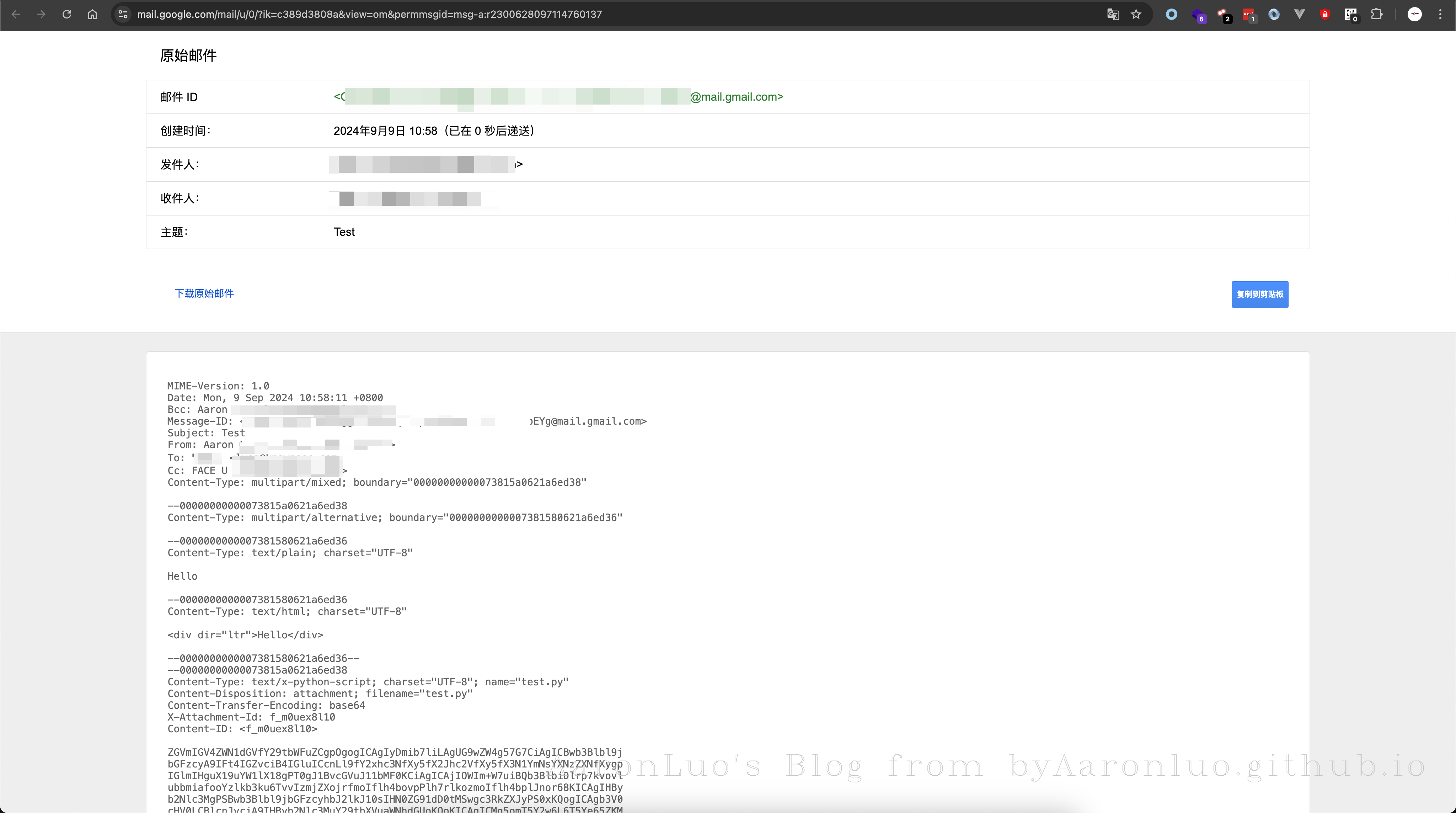 为了尽可能的获取实用的邮件头,使用抄送+密送的方式发一封邮件,查看原文,就可以看到发送的实际内容