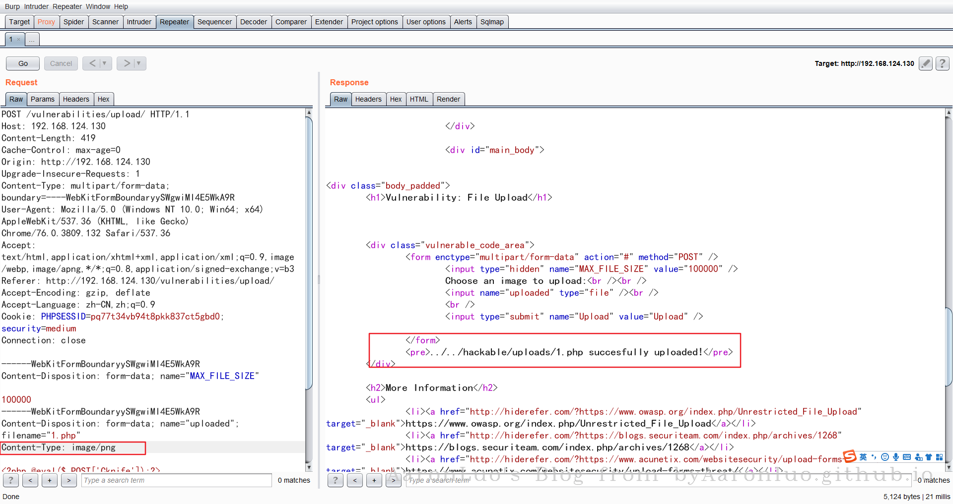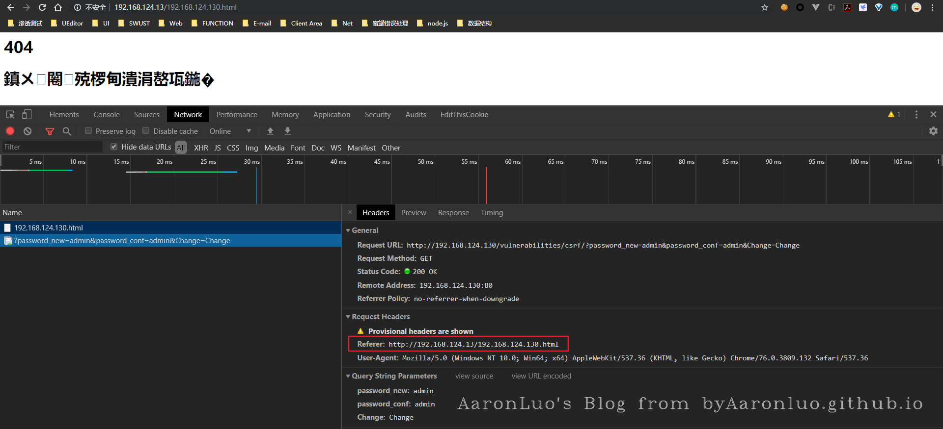 可以看到,Medium级别的代码检查了保留变量 HTTP_REFERER(http包头的Referer参数的值,表示来源地址)中是否包含SERVER_NAME(http包头的Host参数,及要访问的主机名,这里是192.168.124.130),希望通过这种机制抵御CSRF攻击