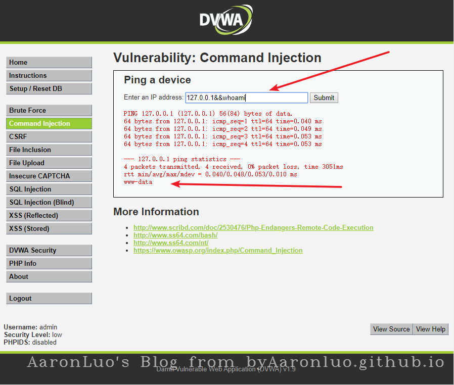 可以看到,服务器通过判断操作系统执行不同ping命令,但是对ip参数并未做任何的过滤,导致了严重的命令注入漏洞