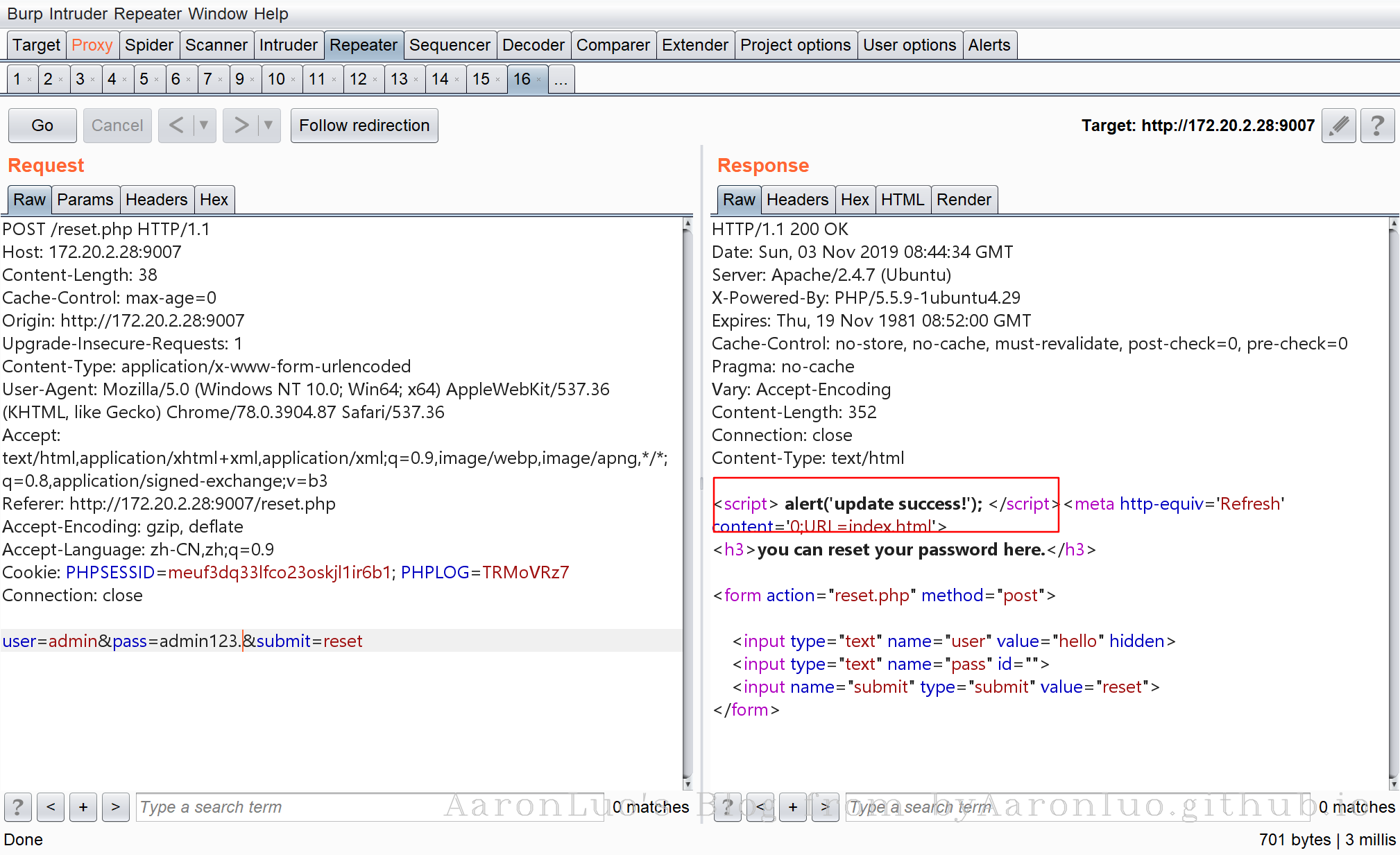 #直接将单引号注释,达到闭合前面的',尝试之后,发现修改的是admin'#的密码