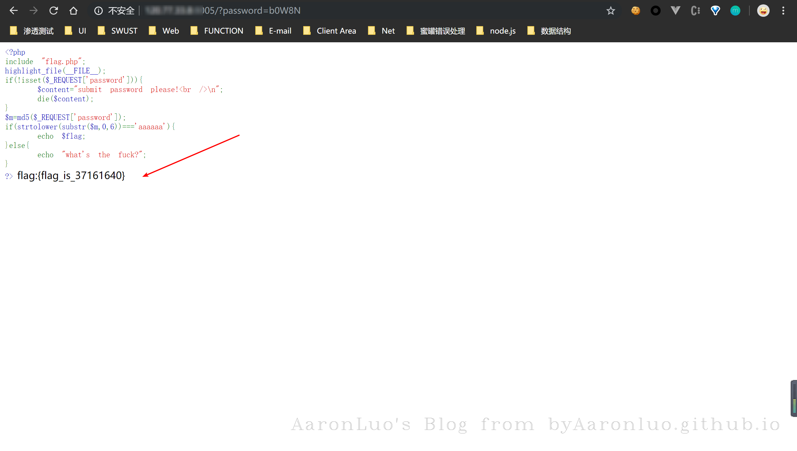 将参数password进行MD5,hash,得到一串hash值,并从0位置截取6位字符(strtolower函数将字符转换为小写)为'aaaaaa',如果相等则输出flag