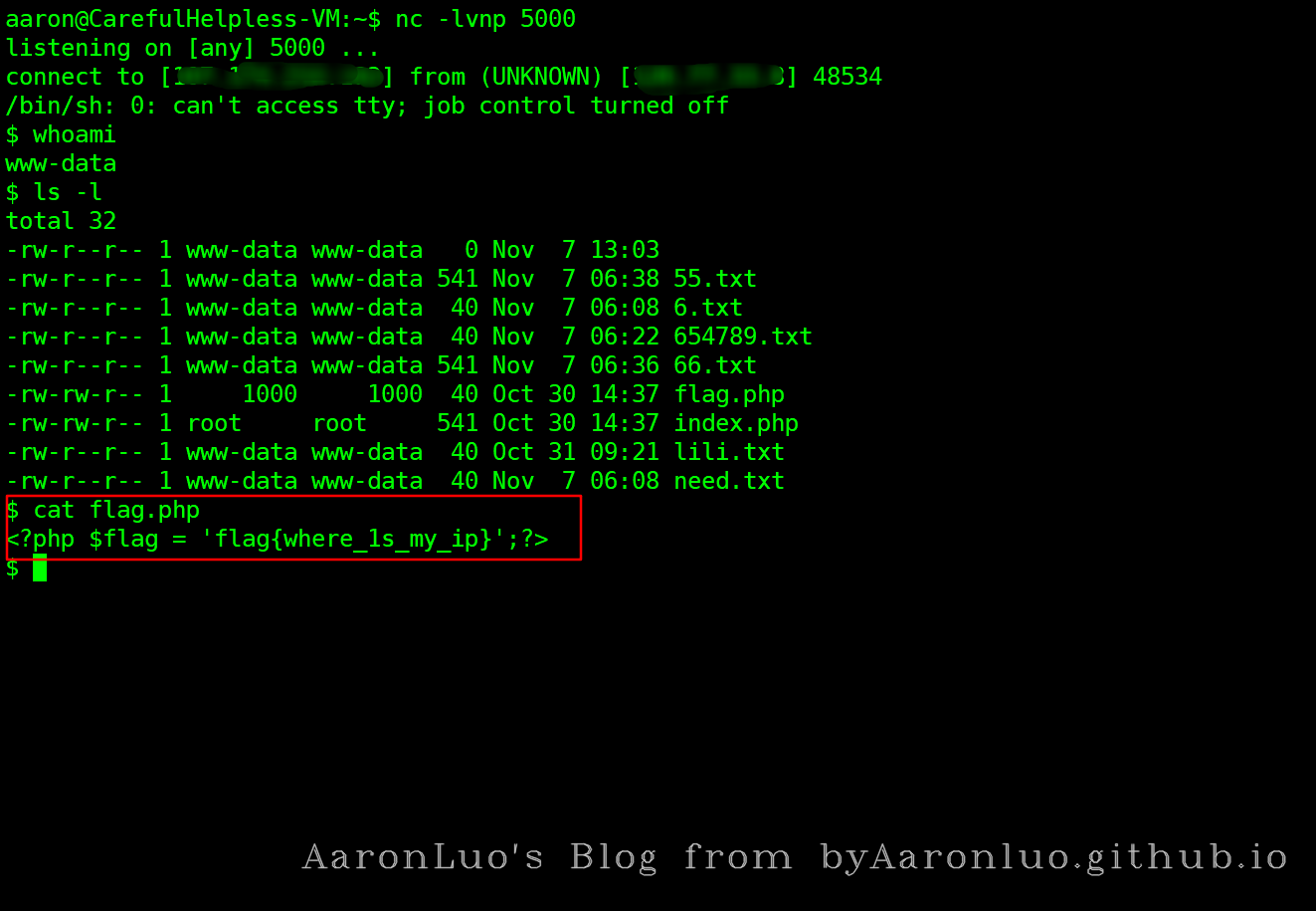 因为此页面是php搭建的,所以使用php 一句话反弹shell,在vps上监听5000端口,在web页面执行php一句话反弹shell,如下图