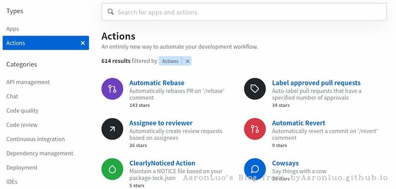 大家知道,持续集成由很多操作组成,比如抓取代码、运行测试、登录远程服务器,发布到第三方服务等等。GitHub 把这些操作就称为 actions。 很多操作在不同项目里面是类似的,完全可以共享。GitHub 注意到了这一点,想出了一个很妙的点子,允许开发者把每个操作写成独立的脚本文件,存放到代码仓库,使得其他开发者可以引用。 如果你需要某个 action,不必自己写复杂的脚本,直接引用他人写好的 action 即可,整个持续集成过程,就变成了一个 actions 的组合。这就是 GitHub Actions 最特别的地方。 GitHub 做了一个官方市场,可以搜索到他人提交的 actions。另外,还有一个 awesome actions 的仓库,也可以找到不少 action。