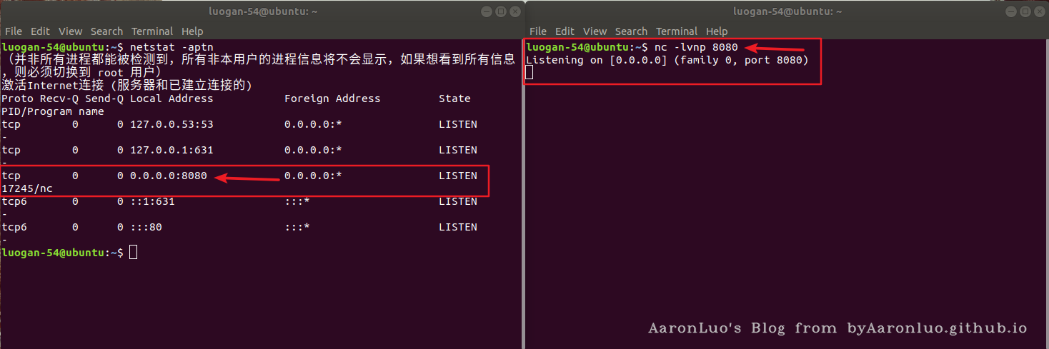 - 测试 - 在Ubuntu上开启tcp8080端口,通过上图可以看见nc 监听了本地的8080端口,且是TCP协议