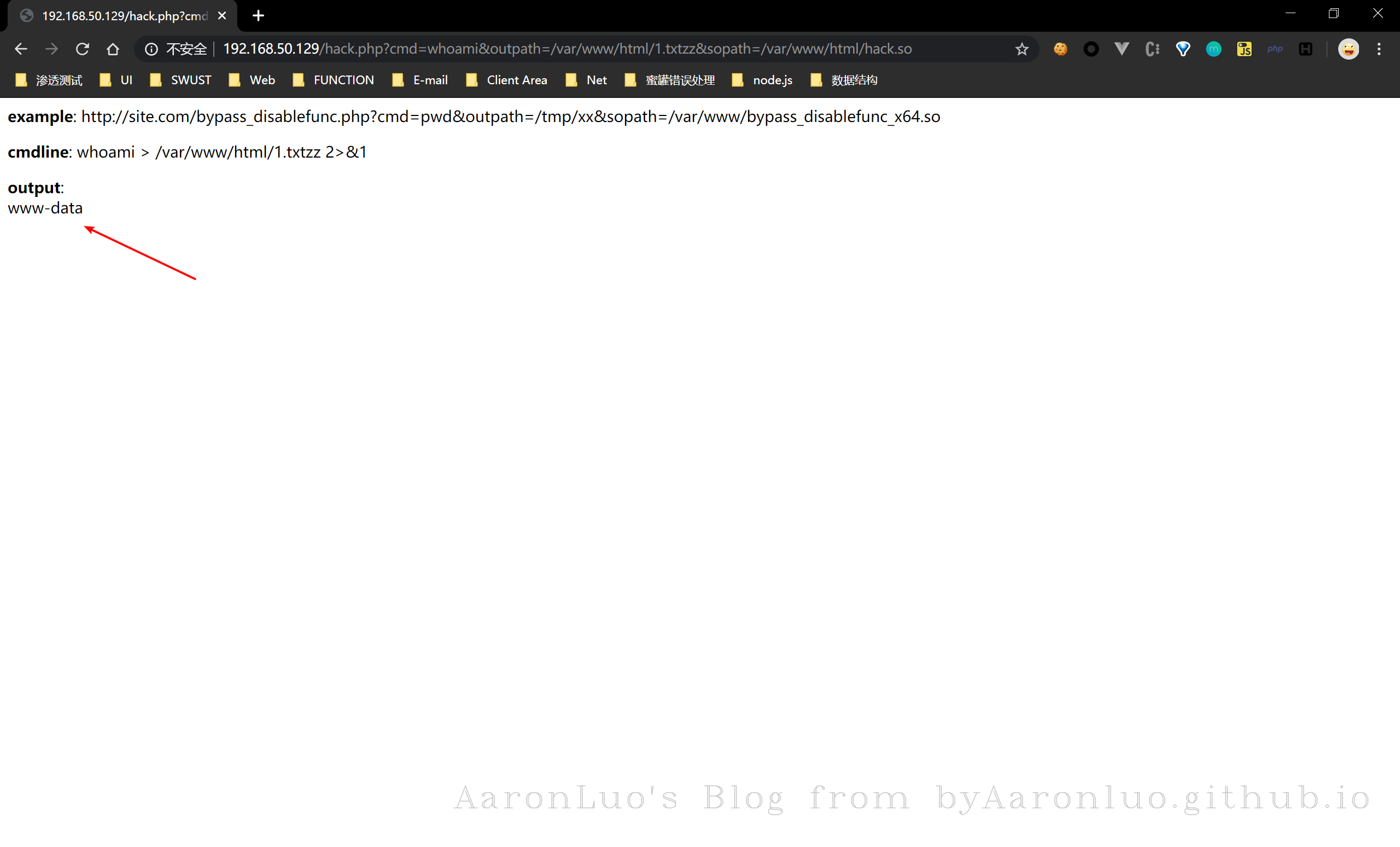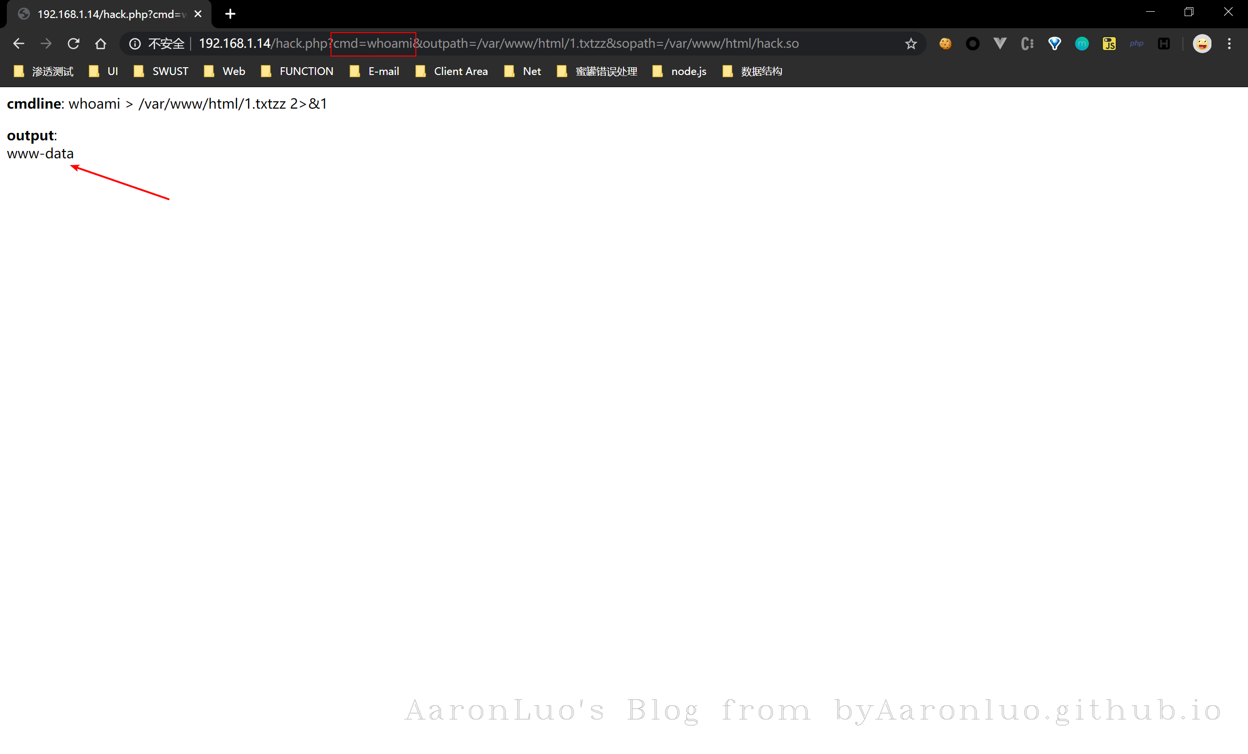 分别将动态库hack.so文件,php脚本hack.php上传到服务器中,再访问hack.php脚本文件,并带上参数cmd(待执行的命令),outpath(结果重定向文件位置),sopath(加载动态链接库的位置)