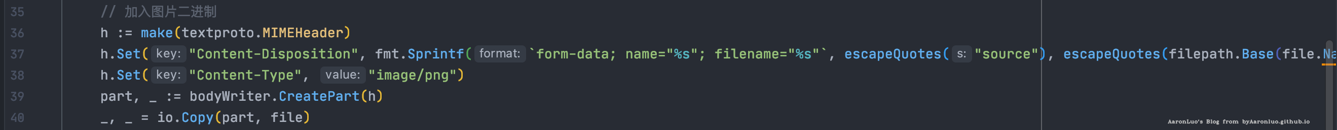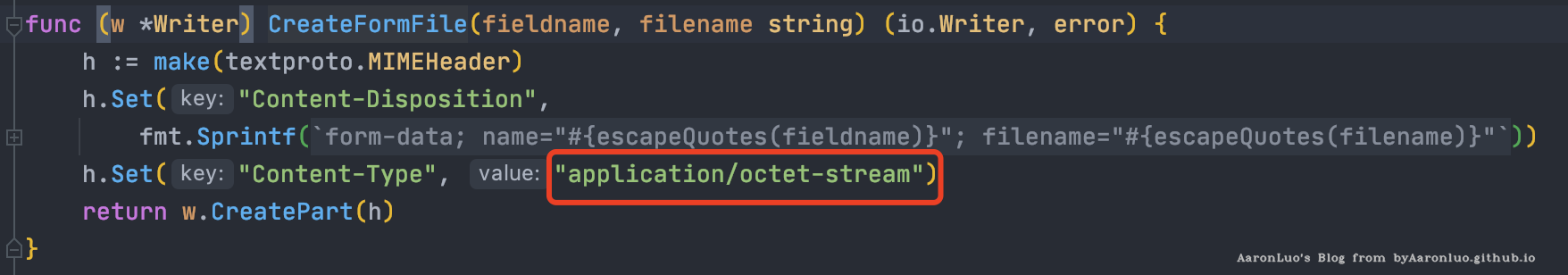 分析这个函数,前面h是header头,也是我们要修改的地方,后面是调用*Writer.CreatePart,我们也模拟这个行为就可以了 所以微调一下代码(直接给代码复制粘贴过来改就可以了,也可以直接重写CreateFormFile函数,后者稍微麻烦一点点)