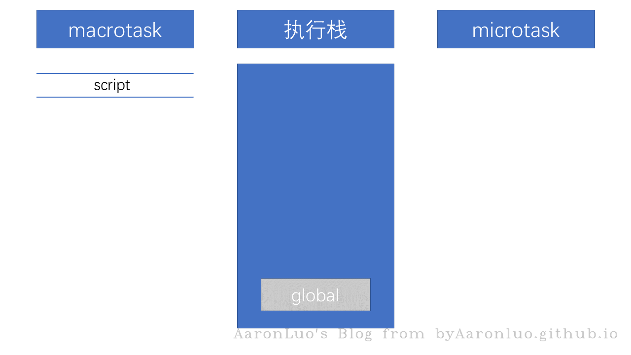 1. 首先,事件循环从宏任务(macrotask)队列开始,这个时候,宏任务队列中,只有一个 script(整体代码)任务;当遇到任务源(task source)时,则会先分发任务到对应的任务队列中去。所以,上面例子的第一步执行如下图所示: