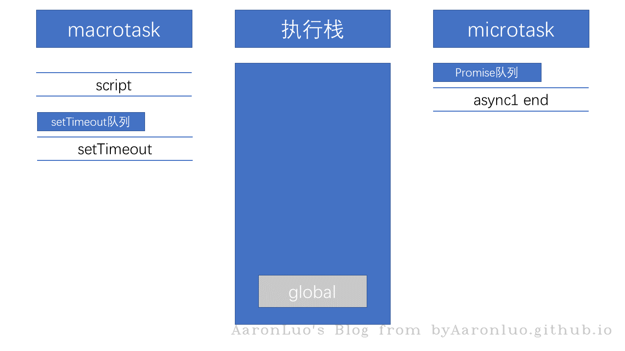 根据上述,每次执行完一个宏任务之后,会去检查是否存在 Microtasks;如果有,则执行 Microtasks 直至清空 Microtask Queue。 因而在 script 任务执行完毕之后,开始查找清空微任务队列。此时,微任务中, Promise 队列有的两个任务async1 endpromise2,因此按先后顺序输出 async1 end,promise2。当所有的 Microtasks 执行完毕之后,表示第一轮的循环就结束了。