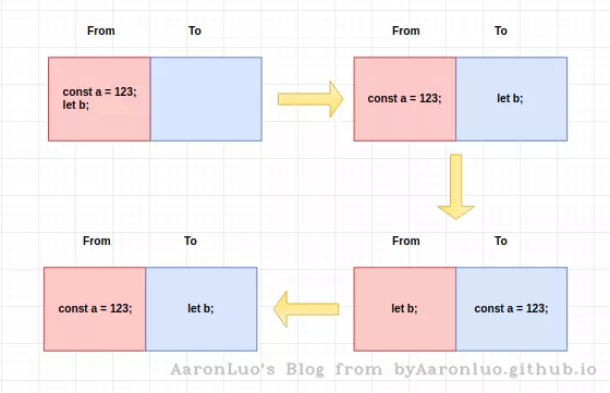 在新生代空间中,内存空间分为两部分,分别为 From 空间和 To 空间。在这两个空间中,必定有一个空间是使用的,另一个空间是空闲的。新分配的对象会被放入 From 空间中,当 From 空间被占满时,新生代 GC 就会启动了。算法会检查 From 空间中存活的对象并复制到 To 空间中,如果有失活的对象就会销毁。当复制完成后将 From 空间和 To 空间互换,这样 GC 就结束了。