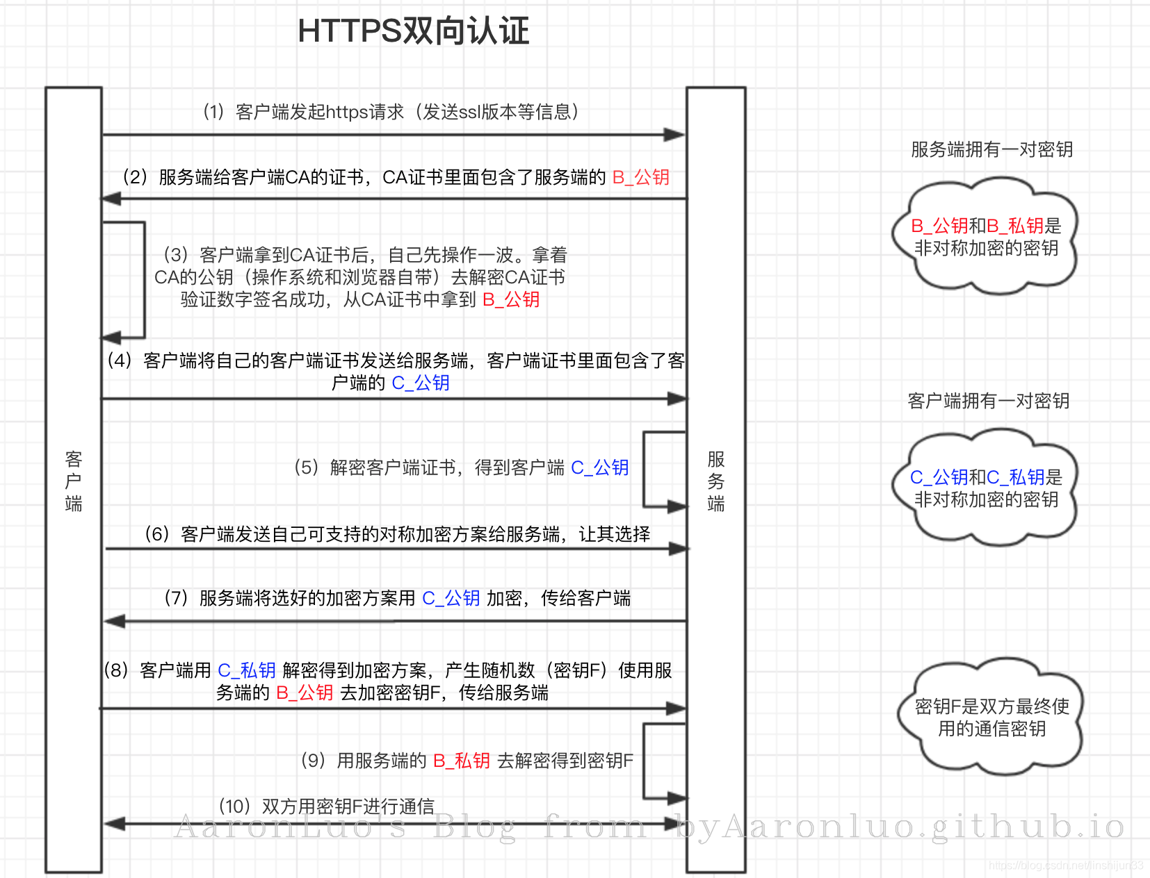 双向认证详细过程如下: (1)客户端发起HTTPS请求,将SSL协议版本的信息发送给服务端。 (2)服务端去CA机构申请来一份CA证书,在前面提过,证书里面有服务端公钥和签名。将CA证书发送给客户端 (3)客户端读取CA证书的明文信息,采用相同的hash散列函数计算得到信息摘要(hash目的:验证防止内容被修改),然后用操作系统带的CA的公钥去解密签名(因为签名是用CA的私钥加密的),对比证书中的信息摘要。如果一致,则证明证书是可信的,然后取出了服务端公钥 (4)客户端发送自己的客户端证书给服务端,证书里面有客户端的公钥:C公钥 (5)客户端发送支持的对称加密方案给服务端,供其选择 (6)服务端选择完加密方案后,用刚才得到的C公钥去加密选好的加密方案 (7)客户端用自己的C私钥去解密选好的加密方案,客户端生成一个随机数(密钥F),用刚才等到的服务端B公钥去加密这个随机数形成密文,发送给服务端。 (8)服务端和客户端在后续通讯过程中就使用这个密钥F进行通信了。和之前的非对称加密不同,这里开始就是一种对称加密的方式